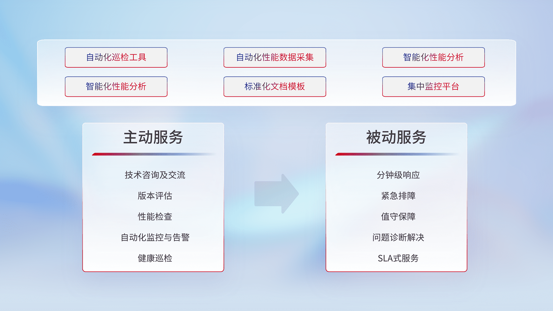 智能化工具和标准化文档,,,,保障服务质量,,,,提供主动服务(包含技术咨询、、版本评估、、、、性能检查、、、自动化监控与告警、、、、健康巡检)和被动服务包含(分钟级响应、、、、紧急排障、、、、值守保障、、、问题诊断解决、、、SLA服务)。。。